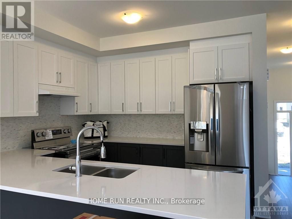 This beautiful open concept home in sought after community of Barrhaven. Amazing 3bed/2.5bath END-UNIT townhouse with 9ft celling on the main floor and finished basement. Ceramic tiles on the kitchen and bathrooms and hardwood flood throughout the first floor. Large kitchen with Granite counter top and pantry room, high-end stainless-steel appliances and island with breakfast bar, spacious dining room and living room. Second floor offer large primary bedroom with 3-piece en-suite and walk-in closet, 2 other good size bedrooms, full 3-piece bathroom and laundry. Finished basement with family room, storage room, and lot of storage room in the unfinished area. Next to park, and close to schools, Costco, Home Depot, HWY, and restaurants. Available June 1st. book your showing today! (id:52350)