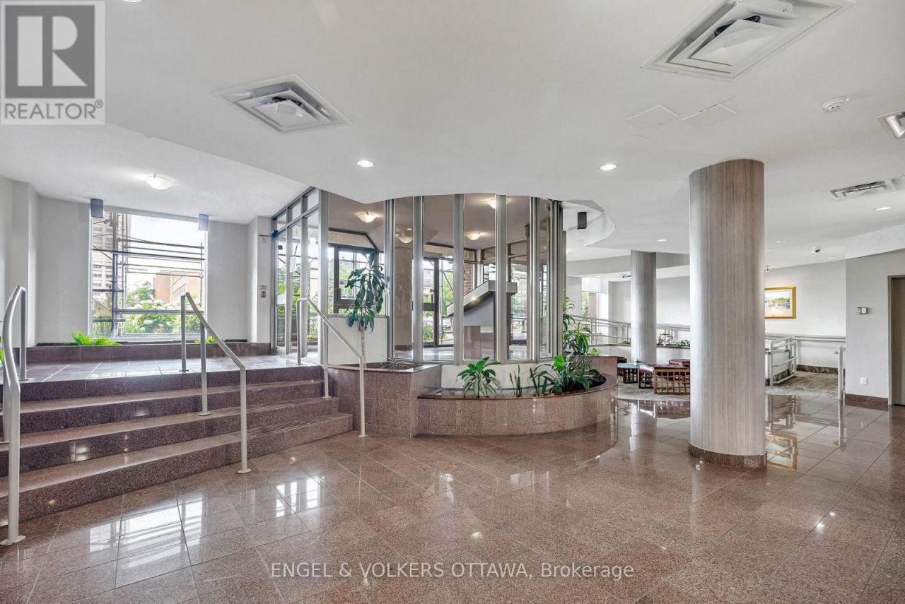 Commanding a premier 6th-floor corner vantage point, this sprawling 1,192 sq foot residence offers house-sized proportions in the heart of Hintonburg. Completely carpet-free and move-in ready, this 2-bedroom, 2-bathroom condo is flooded with natural light and features gorgeous brand-new flooring throughout. The thoughtfully designed layout showcases a generous living area and a dedicated dining space with direct access to a private covered balcony-the perfect spot for summer evenings with the city skyline and Parliament Hill as your backdrop. The updated galley kitchen is a chef's delight, featuring granite countertops, stainless steel appliances, and a convenient in-suite laundry/storage room. The primary retreat is impressively scaled, offering double closets and a private 4-piece ensuite. The second bedroom provides ideal flexibility for a home office or guest suite, located just steps from the second full bathroom. Parkdale Terrace offers a truly walkable lifestyle steps from the Parkdale Market, Tunney's Pasture LRT, and Ottawa River pathways. Residents enjoy premium amenities including an indoor pool, sauna, and party room. Bonus features include heated underground parking with EV charging stations, a large storage locker, and condo fees that conveniently include water. (id:52350)