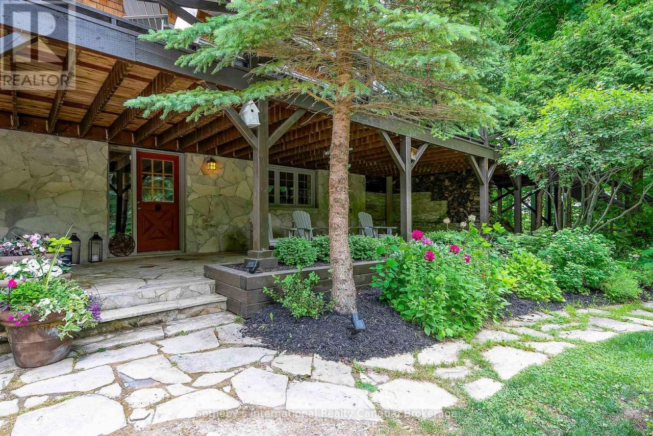 Le Coin Perdu A Private 13-Acre Estate Retreat! Welcome to Le Coin Perdu, a rare sanctuary where timeless craftsmanship meets modern luxury living. Nestled on nearly 13 acres of former vineyard, this private estate offers trails, a managed forest with 300-500 new trees planted annually over 20 years, and a tranquil pond creating the ultimate retreat in nature.Step inside the custom-built residence completely renovated in 1998. Experience rustic elegance at its finest. Hand-hewn post-and-beam timber ceilings, flagstone and BC Pine flooring, and two dramatic stone fireplaces showcase authentic artistry with locally sourced stone and granite finishes. Oversized windows flood the home with light, framing views of lush greenery. The gourmet kitchen features a striking stone sink, stainless steel appliances, reverse osmosis water system, and a dining area with a solid wood table and wraparound banquette perfect for hosting family and friends.The spa-inspired bath offers a jet soaker tub, rainfall shower, and a cedar sauna for four. Outdoors, unwind in the hot tub beneath a canopy of trees, refresh in the outdoor shower, or relax on expansive wraparound decks. The private primary suite includes its own deck for sunset views. A detached 2-car garage built in 2006, crafted with vintage barn board and fieldstone, features a finished 30x40 loft with kitchenette, brass sink, pool table, TV lounge, and full field stone bathroom with open shower ideal for entertaining. Located minutes from Georgian Bays pristine shoreline, Meaford Harbour, premier golf, ski clubs, hiking, biking trails, and vibrant local markets, Le Coin Perdu offers an unmatched lifestyle of luxury, privacy, and adventure.This one-of-a-kind retreat blends European charm, rustic warmth, and modern amenities into a legacy property designed for those who value nature, comfort, and timeless beauty. (id:52350)