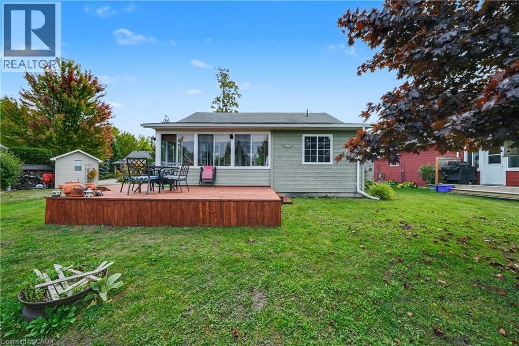Located in the popular Lakes of Wasaga resort community, this charming year-round home offers 856 square feet of living space, including a bright two-season sunroom. The community provides a resort lifestyle with access to tennis courts, mini golf, pools, and children's play areas. Inside, the home features two bedrooms and a three-piece bathroom with a newly updated sink backsplash. The spare room includes a built-in Murphy bed and desk, providing a flexible option for guests or a home office. The open-concept living room, dining room, and kitchen showcase cathedral pine ceilings and walls, creating a warm, inviting atmosphere. Convenience is enhanced with a stacked washer and dryer. Additional highlights include an in-ground irrigation system, generous-sized shed, and freshly stained front and back decks as well as the sunroom floor. A new AC unit was installed in May 2025. The backyard features a fire pit, perfect for relaxing evenings. The home also offers a four-foot crawl space with ample storage, housing the furnace and hot water heater. A paved driveway provides parking for three vehicles. From here, it's just a short walk along two dedicated paths to New Wasaga Beach. Monthly fee of $772.01 (on leased land) includes property taxes, lease fee, maintenance. (id:52350)