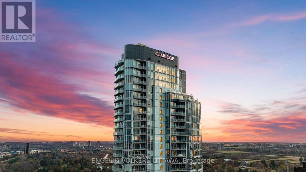 A SKY RESIDENCE ABOVE IT ALL. Perched high above Little Italy in The Icon, this beautiful 1,160 sq.ft. 2-bedroom, 2-bath condo captures breathtaking panoramic views from the Gatineau Hills across Dow's Lake and beyond, with spectacular light from sunrise to sunset. 3 private balconies extend from the principal rooms, creating a sense of openness. Recently reimagined with exquisite porcelain flooring, the interior feels sophisticated and entirely bespoke. A dramatic marble-inspired feature wall anchors the living space, paired with a sleek contemporary fireplace that introduces warmth and striking visual impact. Two imported statement chandeliers bring sculptural elegance and unmistakable glamour. Brushed gold detailing is integrated throughout the main living areas, from custom baseboard trim to upgraded faucets, hardware and kitchen sink, creating an elevated aesthetic. The kitchen is sleek with quartz surfaces and stainless-steel appliances. The primary suite offers a serene retreat with a beautifully designed walk-in closet and an elegant ensuite featuring a glass shower. A well-proportioned second bedroom provides flexibility for guests or a sophisticated home office. A beautifully appointed main 4-piece bathroom completes the home, finished with refined materials and a clean, timeless aesthetic. Electronic sun and heat screens and blackout blinds offer comfort and privacy at the touch of a button. In-unit laundry adds everyday convenience. Included is one of the building's most desirable three-sided parking spaces with two storage units. Life at The Icon places you moments from Dow's Lake, the Rideau Canal, and the restaurants of Little Italy. With a pool, sauna, gym, theatre, and guest suites. The Icon delivers an amenity-rich lifestyle with the feel of an urban resort. An exceptional opportunity to own a meticulously upgraded residence in one of Ottawa's most dynamic neighbourhoods. This is elevated living: Architectural. Intentional. Unforgettable. (id:52350)