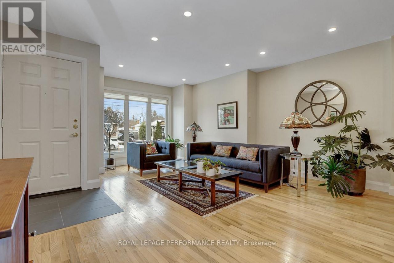 Absolutely stunning and tastefully updated end-unit townhouse on extra deep lot in Overbrook half a block from the Rideau River! Bright and airy open-concept main living area ideal for entertaining with large principal sized rooms, floor-to-ceiling windows, timeless hardwood floors, and recessed lighting. Stylish high-end custom chef's kitchen with sleek white cabinetry, quartz countertops with waterfall edge, stunning backsplash, 6-burner gas stove, and centre island with built-in seating. Enjoy the bonus main level family room with cozy fireplace, patio doors leading to south-facing outdoor living space, and lovely sight-lines of kitchen. Updated hardwood staircase with stainless and glass railing. Impressive primary bedroom retreat with wall-to-wall closets. Spa-like ensuite with dual-sink vanity, walk-in glass enclosed shower, and skylight for extra natural light. Well-proportioned secondary bedroom. Spacious loft with skylight and closet can easily be converted back to bedroom or makes for perfect home office. Finished lower-level with convenient mudroom, 3-piece bathroom, versatile family room, and inside entry to oversized 1-car attached garage. Private and fenced south-facing backyard with patio, retractable awning, gas line for BBQ, perennial gardens, and storage shed. Easy access to 417, Ottawa's expansive bicycle path network along the Rideau River, and downtown Ottawa via the Adawe Footbridge to Sandy-Hill. Popular Riverain Memorial Children's Park around the corner. Walk to the community hub at the Rideau Sports Centre where you can eat, do yoga, work-out, swim, play tennis and pickleball. Don't forget about the dog park, basketball courts, splash-pad, skate-park, and the Rideau Winter Trail all at your doorstep. Come see what the fuss is all about in Overbrook in one of Ottawa's best kept secrets. (id:52350)